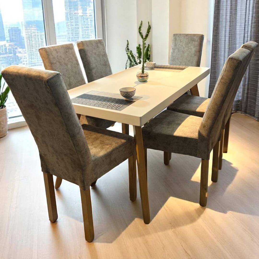 Transforma tus reuniones familiares y cenas especiales con el comedor Texas de 6 puestos, una pieza que combina diseño moderno y acabados de alta calidad. Su mesa de líneas limpias y estructura robusta se complementa perfectamente con sillas tapizadas en tela suave, brindando una experiencia cómoda y sofisticada para cada comensal.